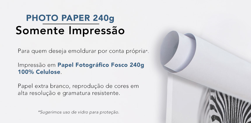 Impressão em Papel Fotográfico Fosco 240g, 100% celulose.